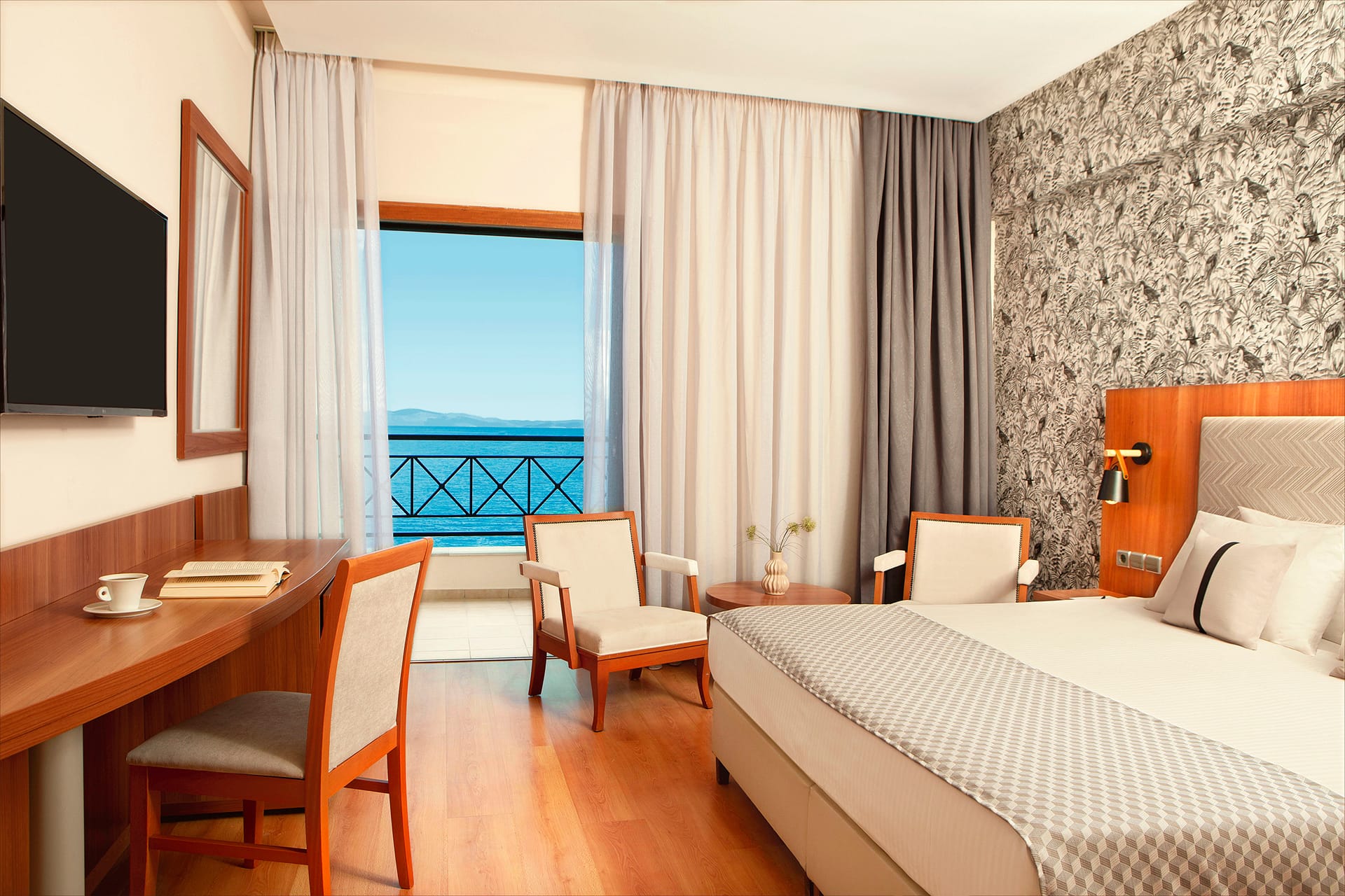 Our Superior Double Rooms with Sea View are spacious rooms with a private balcony and stunning view to the Evian Gulf. They come with double bed or twin beds, and they feature a plethora of modern amenities. Satellite LCD TV, mini fridge, air conditioning and heating, a spacious bathroom with free toiletries and a safe deposit box all compose a contemporary retreat in Mati. Topped with cordial services, this is a great accommodation option for those visiting Athens and the wider area of Attica. A wonderful stay is guaranteed in a fully functional and bright room where you can relax and enjoy!